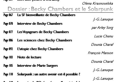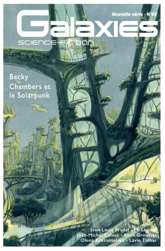 eux tristes nouvelles sont tombées pendant que nous finalisions le texte de ce numéro 93 de Galaxies : les décès subits de deux grands auteurs de notre genre de prédilection : Jean-Louis Trudel, le 17 novembre, à Vilnius, lors d’une résidence d’écriture, et Pierre Bordage, le 26 décembre en Bretagne. Nous leur rendons chacun hommage, en page 190 pour Jean-Louis, et en page 191 pour Pierre. Condoléances à leurs familles. Le dossier ouvert dans ce numéro s’intitule « Becky Chambers et le Solar punk ». Becky Chambers est une Autrice dont les œuvres sont traduites et publiées en France par les éditions l’Atalante, à Nantes. Elle écrit dans ce genre qu’on désigne sous le nom de Solar punk, et qui se trouve finalement très proche des Mundanes auxquelles nous avions consacré, il y a quinze ans, notre deuxième hors-série.